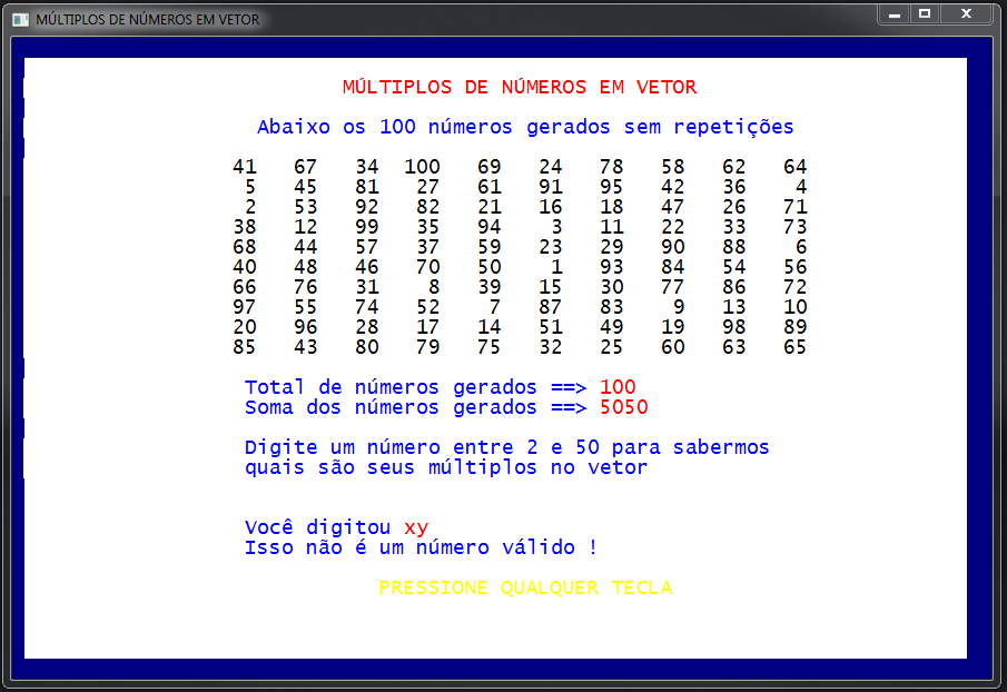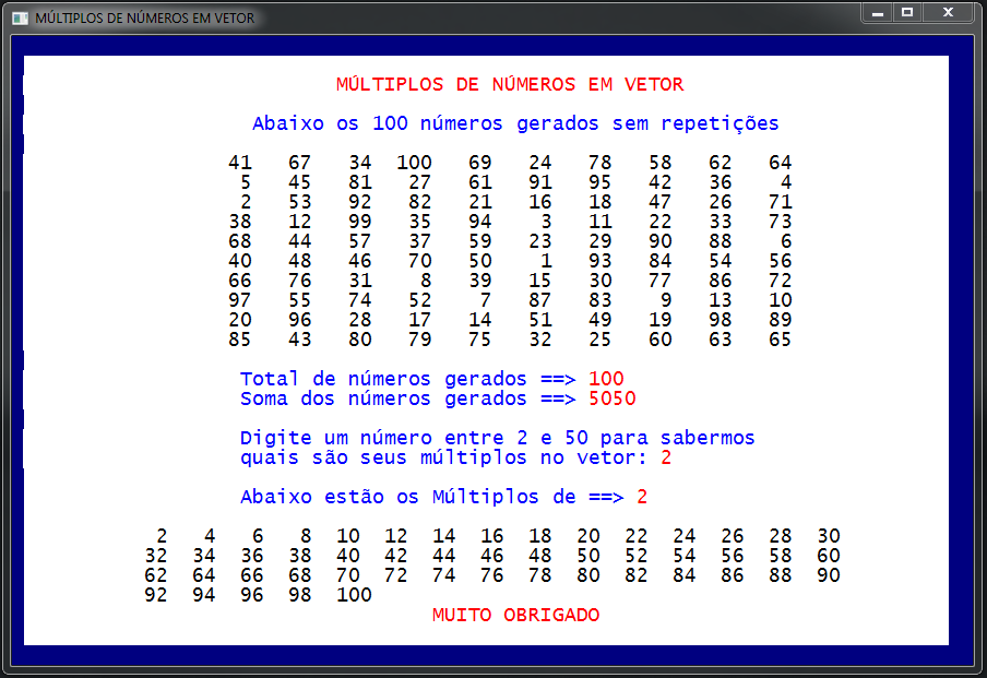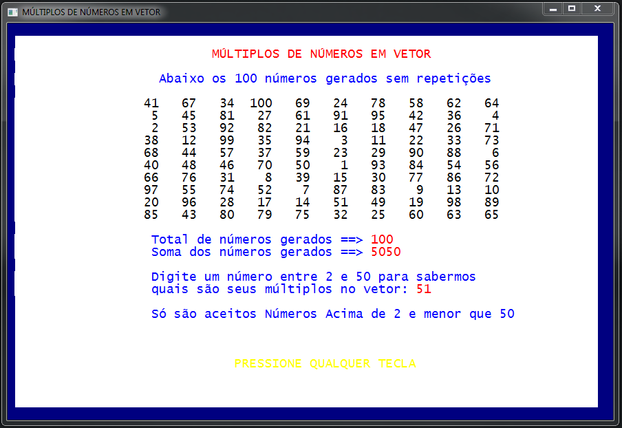 Neste programa eu aproveito a função Gera_Num_Sem_Repetidos ( int *A ); Que foi usada num código anterior, ela gera números aleatórios de 1 a 100 sem repetições e copia num vetor que foi alocado dinamicamente na função main(); e passado uma cópia como parâmetros para a função citada acima. Após a impressão dos números na tela do cmd personalizado pelas côres utilizadas e textos bem posicionados com o uso fe funções da biblioteca conio.h, aliás, isto é um hábito que tenho, e muitos me criticam por isto, a entrada de dados pede que se digite um número entre 2 e 50, e aqui há restrições, para que não passe números inferiores ou superiores ao que foi solicitado, barrando também caracteres. Então é apresentado os múltiplos do número inserido. Mais uma contribuição aos iniciantes em linguagem C.