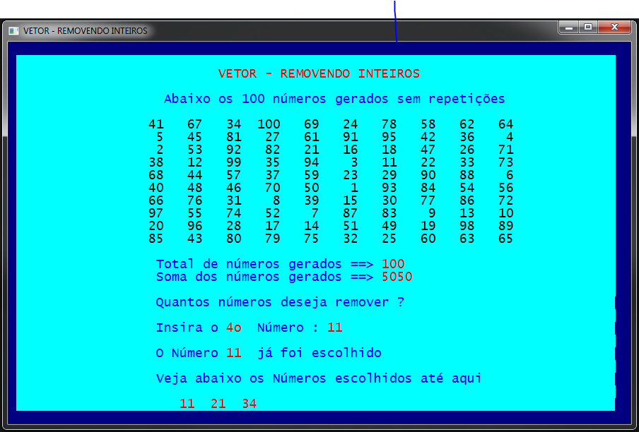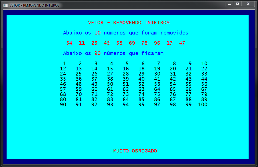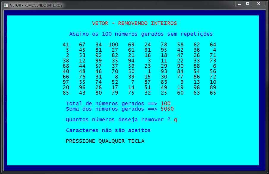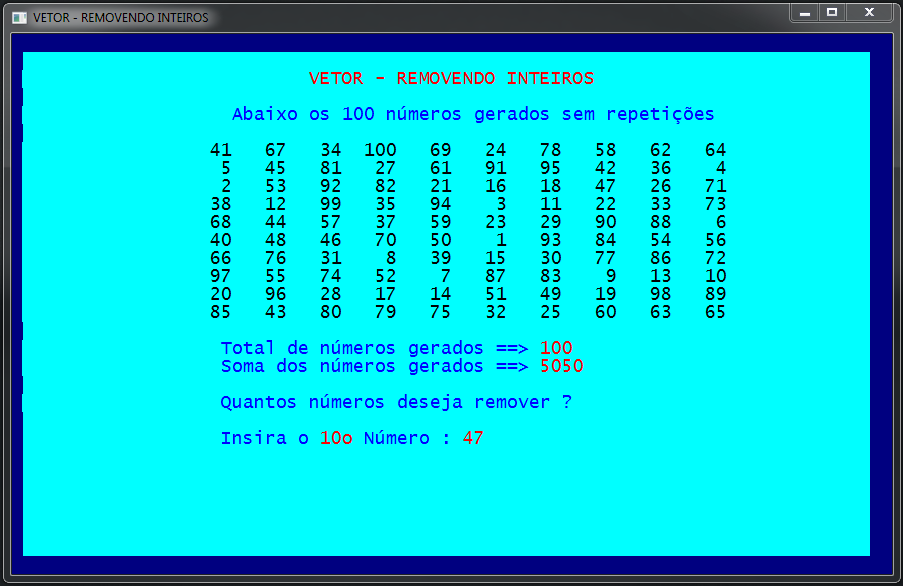 Para os apaixonados por linguagem C, apresento este excelente código didático,onde a finalidade é de remover elementos que foram gerados e armazenados num vetor de 100 posições. O código possui tantos recursos em suas mais de 270 linhas que prefiro não comentar, ficaria enfadonho falar de cada um deles. É preferível que o futuro programador já tenha bons conhecimentos desta importante linguagem.